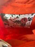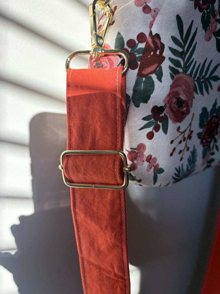 Soft florals meet warm sunset tones in the Sunset Rose Crossbody. Featuring a romantic rose print paired with a rich coral strap, this handmade purse is designed to be both beautiful and practical. Lightweight yet roomy, it’s perfect for carrying your everyday essentials while keeping your hands free.